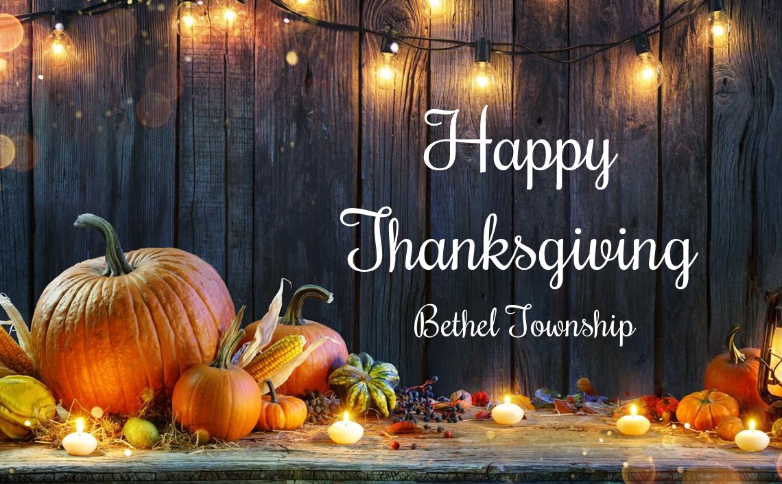 In observance of the Thanksgiving Holiday, the Bethel Township Administrative Offices will be closed on Thursday, November 27th and Friday, November 28th, 2025. Normal business hours will resume on Monday, December 1st, 2025 at 8:00 AM.