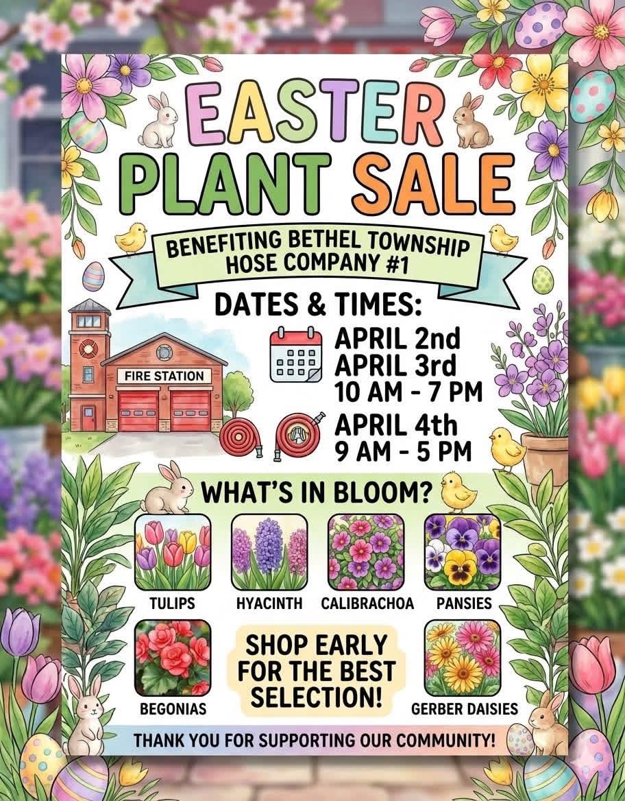 Bethel Township Hose Company #1 will be holding its annual Easter flower sale beginning Thursday April 2nd through Saturday, April 4th. Hours for April 2nd and 3rd are 10 AM - 7PM, & 9 AM - 5 PM Saturday or until they sell out. All proceeds benefit the fire company. Please stop by and help support our all volunteer fire company!Β π·πΈπΌπ»